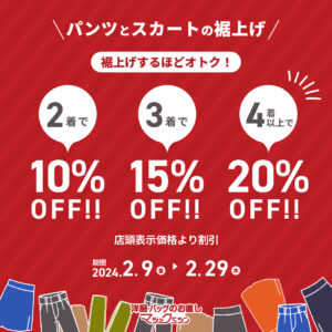 パンツ・スカートの裾上げ着数に応じて「最大20%OFF」に!