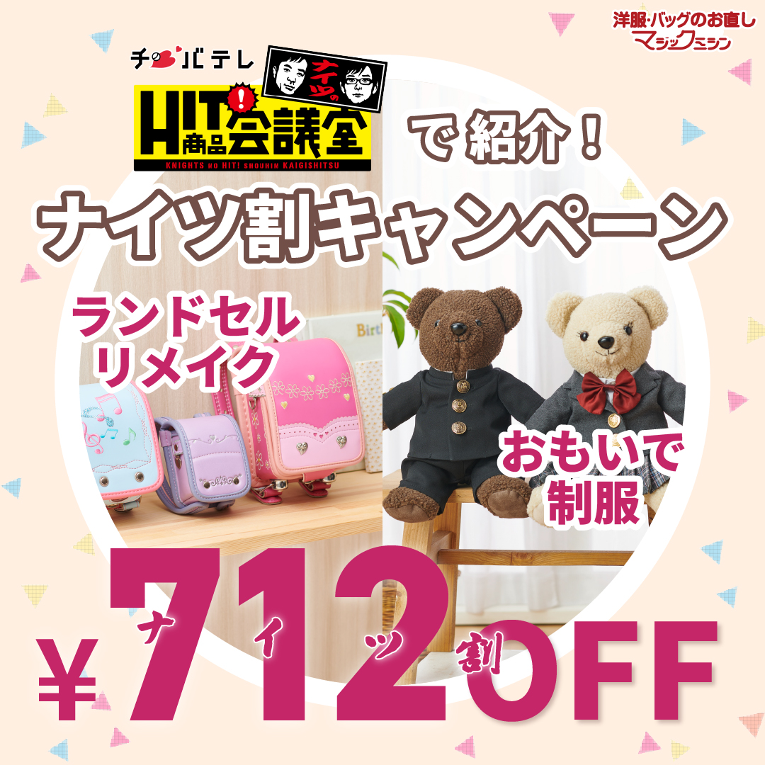 2024年3月1日~5月31日の期間中、番組でも紹介された「ランドセルリメイク」と「制服リメイク」を、店頭表示価格から712円オフでご利用いただけます!