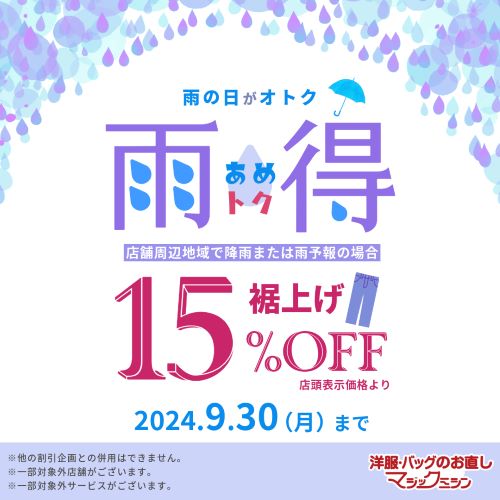 雨の日は裾上げがオトク!雨得キャンペーン実施!