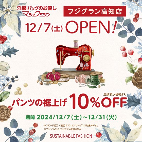 お知らせ 洋服・バッグのお直しのマジックミシンフジグラン高知店が、2024年12月7日(土)にオープンいたします!